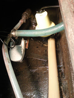 We hangen een paar bouwlampen op, hozen (achterhoos is vol!), maken de pomp in de achterhoos schoon en installeren daarvoor een stopcontact en stekker via een aparte vlotterschakelaar, de tweede, die ook door Dick is gedoneerd. Snoertjes bloot strippen! Solderen van de blote puntjes, en monteren aan stopcontact, stekker en vlotterschakelaar. Even proefdraaien en ja, alles werkt perfect.
